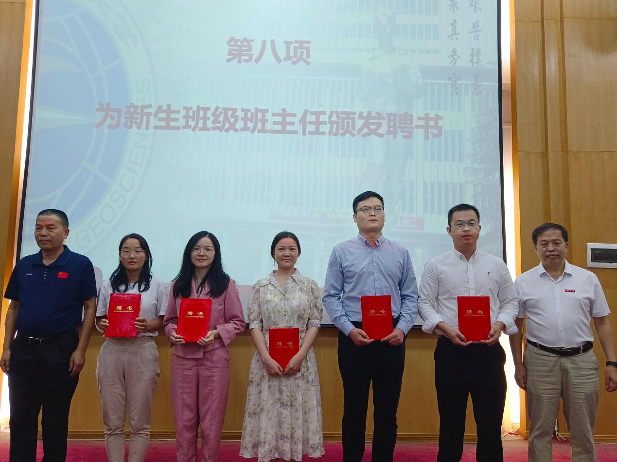 典礼第八项,院党委书记杨昌锐和院长杨树旺为新生班级班主任代表颁发聘书。
