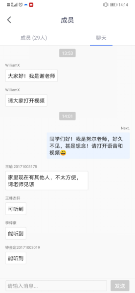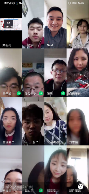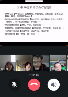082181班学习委员田敬宇尽职尽责,就开展网上教学以来的学习情况也进行了全面细致的汇报。他说:“身为学生,我们的本职工作就是努力学习,掌握知识,回报社会。疫情当前,我们已经上了三周的网课。从一开始的手足无措到现在的熟稔积极,老师们积极引导,同学们努力配合,网课学习也渐渐步入正轨。”他介绍,本班课堂考勤总体情况良好,同学们逐渐适应网课学习,并加强和老师们的互动。