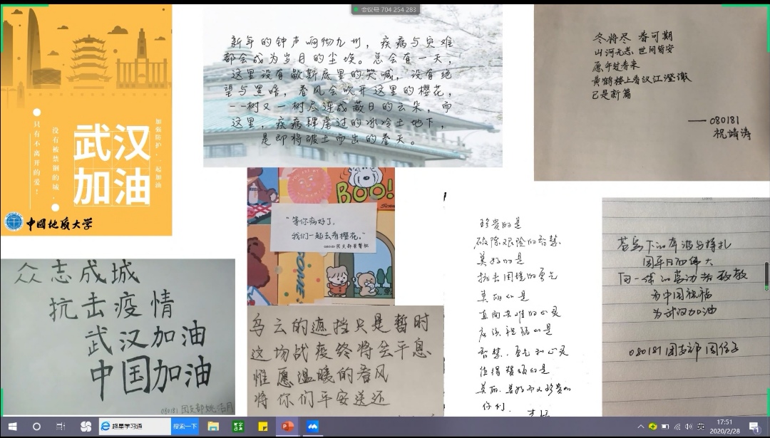 班会中,团支书刘亚旭以我们身边的校园卫士、地大校友、青年榜样的鲜活典型为例,讲述了在疫情期间默默为人民付出的事迹,让同学们引起共鸣。听从党的召唤,风雨兼程到校医院工作的刘艳华;不知姓名为学校教学楼消毒的校园卫士;拥有24年党龄的地大校友,火神山、雷神山项目后勤保障内外部总协调负责人罗飞;还有为抗击疫情贡献自己的力量的志愿者同学们和可爱的班主任刘耕老师都是我们学习的榜样。他说“有党和国家的领导,有人民群众的众志成城,我们有理由相信在不久的将来疫情就能够的得到有效的控制。”来自武汉的余佳颖、方一楠同学对疫情感受最为真切。她们分别向大家分享了身在武汉的生活感受,以及讲述了受抗击疫情前线的妈妈的影响,在社区担任志愿者的故事。