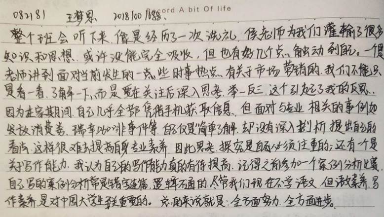近两个月以来,同学们在按时完成学习任务的前提下,坚持每周观看一期讲座并自觉做好笔记。观看结束后,大家还会结合疫情背景与身边的营销案例,记录自己的学习感悟并及时向学委、老师反馈,可谓是收获颇丰。