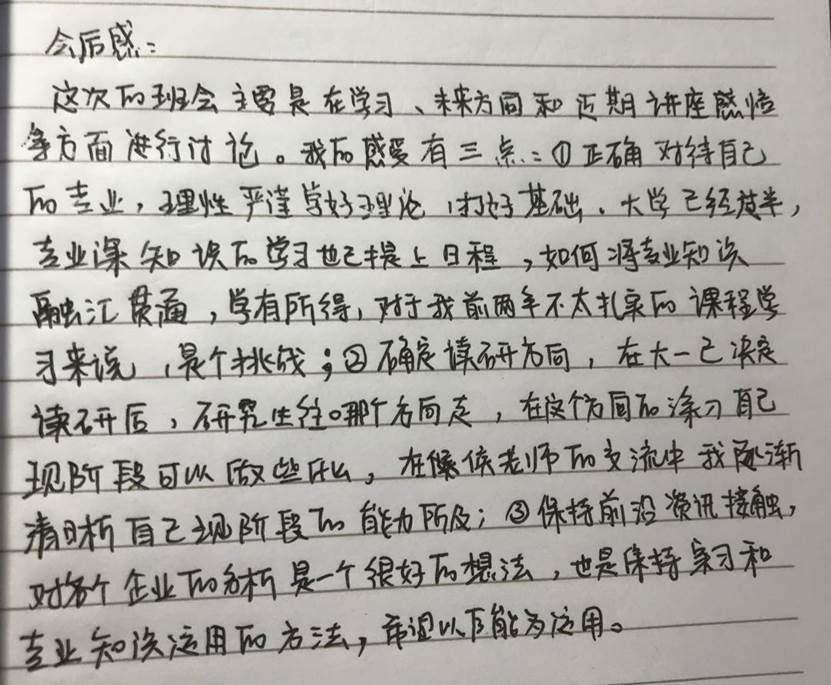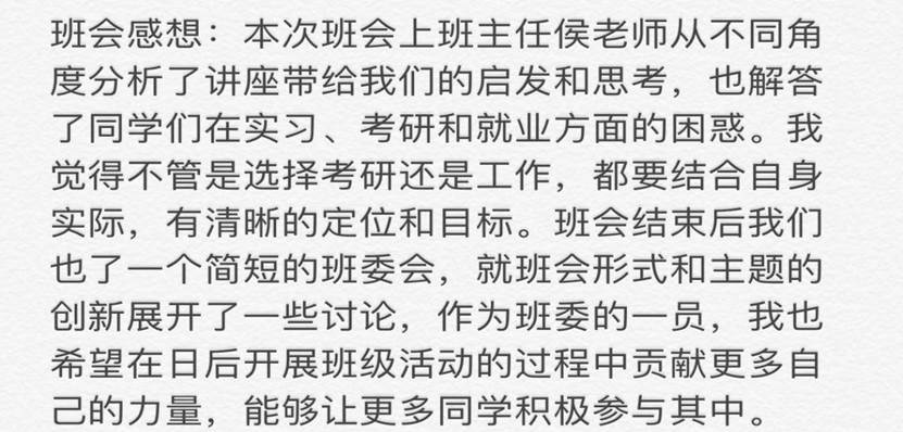 不知不觉间,班会已经持续两个小时,大家渡过了一个充实又有趣的中午,都感觉受益匪浅,老师同学们之间的交流让大家感受到了无比的亲切踏实,并对之后班会形式的调整提供了新思路。大家互相的思念和对武汉对地大却愈发浓郁,相信我们相聚于武汉的那天,一定是是个阳光明媚的日子!班会过后,同学们都积极认真总结感悟和反思。