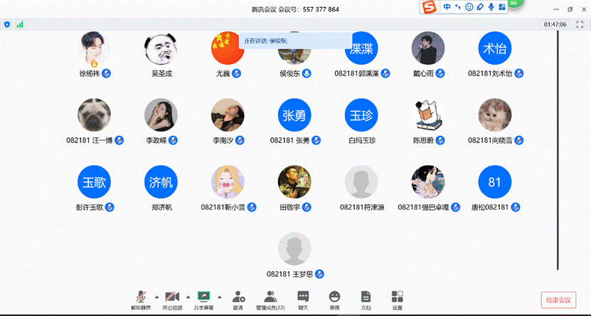 (学生记者:田敬宇)4月30日,“五·一”劳动节、“五·四”青年节双节来临之际,082181班在云端迎来22个小头像的再相聚。班主任侯俊东老师专题召开“停课不停学,居家不松懈”主题班会,动员大家积极准备期末考试,掌握学习方法,同时强调小长假疫情防控安全。班长徐扬祎主持班会。